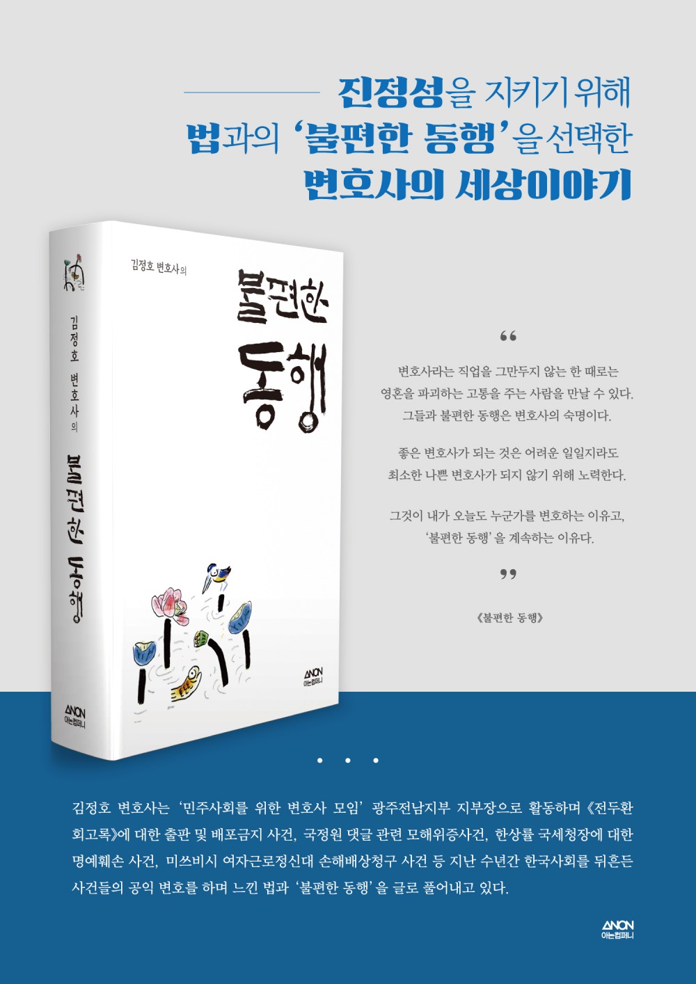 김정호 변호사는 ‘민주사회를 위한 변호사 모임’ 광주전남지부 지부장으로 활동하며 《전두환 회고록》에 대한 출판 및 배포금지 사건’, ‘국정원 댓글 관련 모해위증사건’, ‘한상률 국세청장에 대한 명예훼손 사건’, ‘미쓰비시 여자근로정신대 손해배상청구 사건’ 등 지난 수년간 한국 사회를 뒤흔든 사건들의 공익 변호를 하며 느낀 법과 ‘불편한 동행’을 글로 풀어내고 있다.