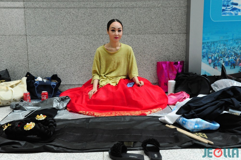 그의 주위로 전통춤에 갖춰 입을 복장들이 반원을 그리며 놓여있다.