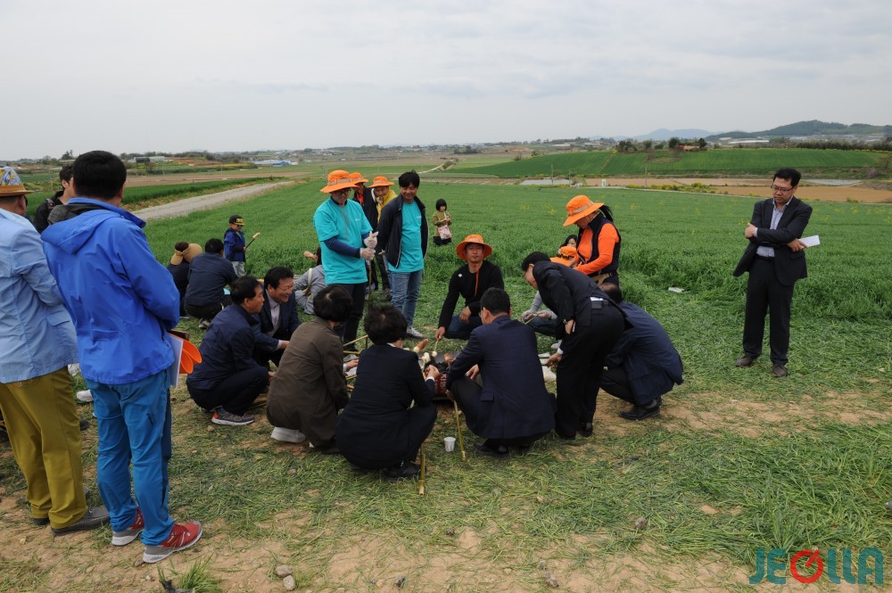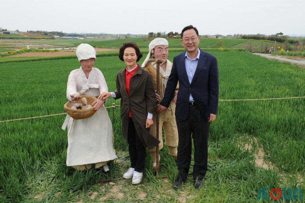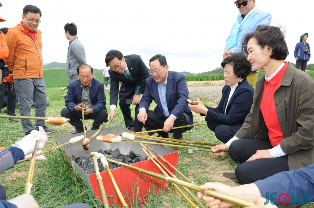 무대에서 공연이 이어지는 사이 명현관 군수, 강형석 부군수, 이순이 해남군의회 의장, 서해근 군의원, 그리고 해남군 공무원들이 보리밭 사잇길로 농장 탐방에 나섰다. 사잇길을 걷다가 추억의 밀떡도 구워보고, 보리밭에 세워진 농부 부부와 기념사진도 찍고, 당연히 사랑에 빠져야 하는 'lOVE' 앞에서 단체 사진도 찍었다.