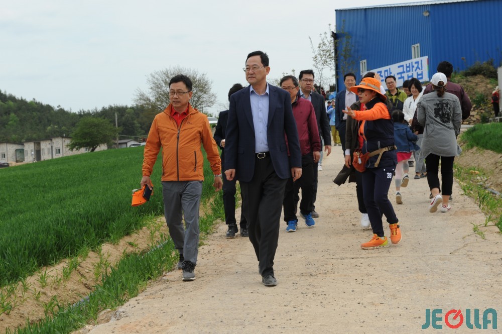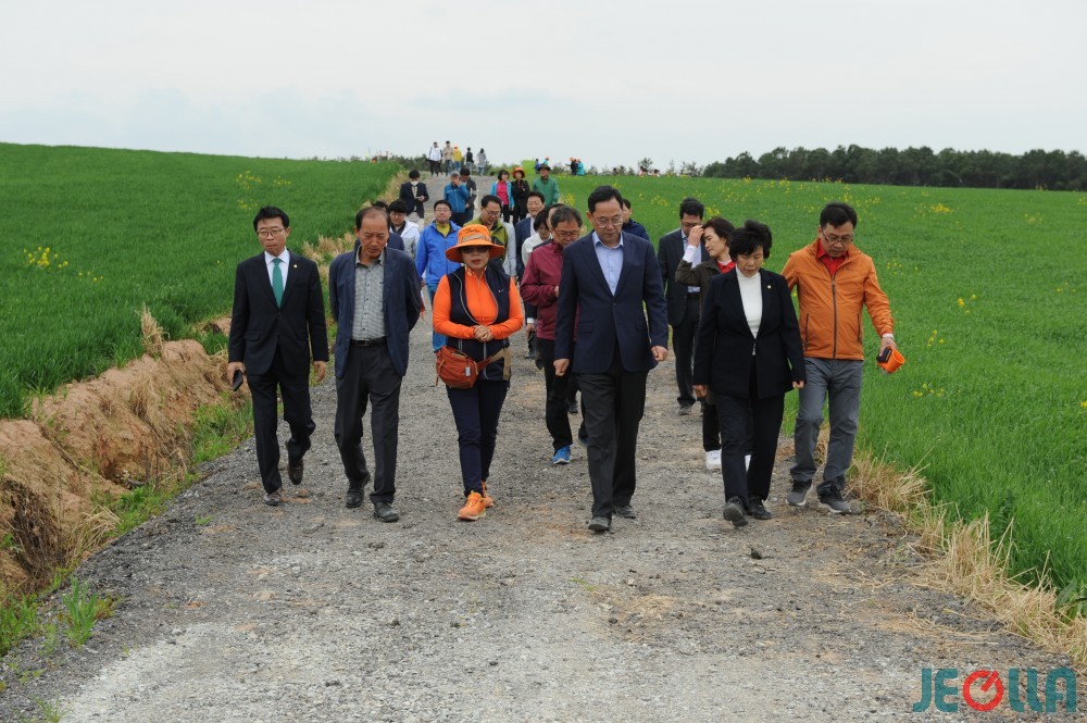보리밭 사잇길 걷기에 나선 명현관 군수와 농장 주인 그리고 해남군 공무원