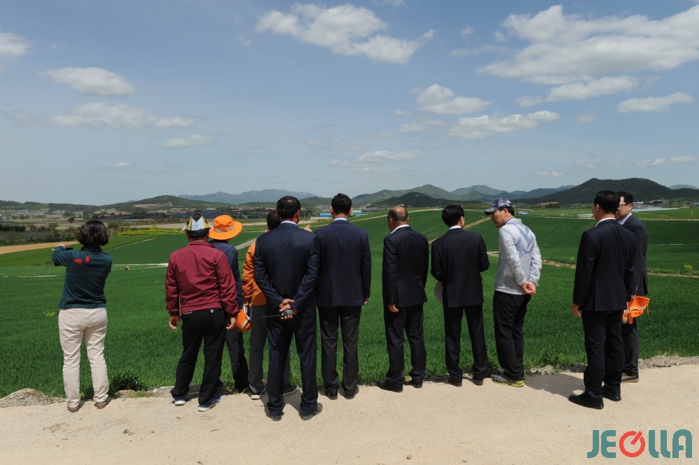 보리밭을 바라보며 숙의 중인 명현관 군수와 해남군청 공무원