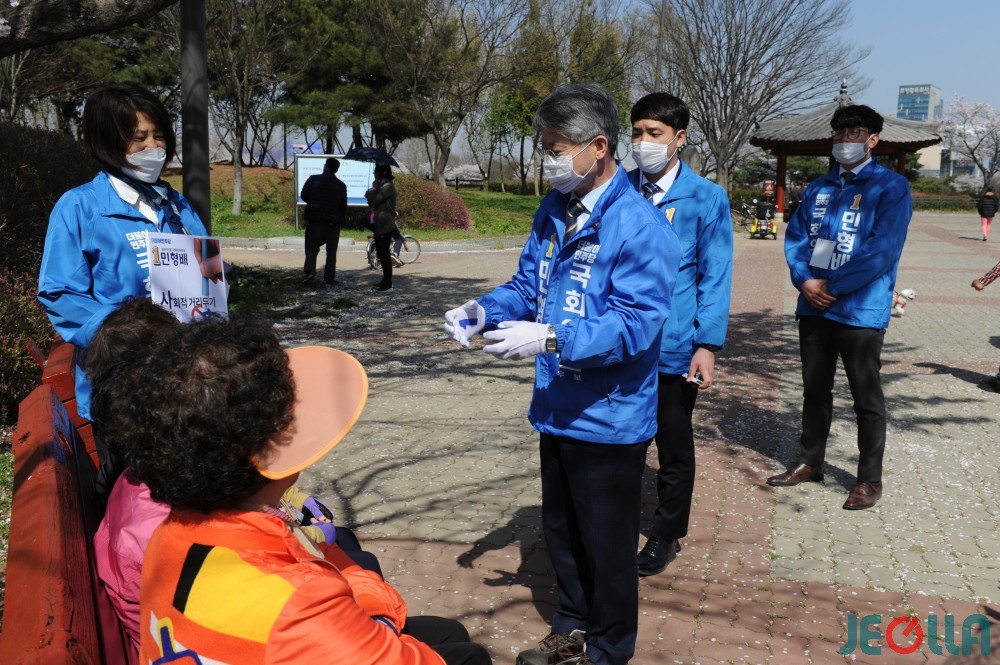 광주 광산을 민형배 더불어민주당 후보가 첨담쌍암공원에서 주말 나들이에 나선 시민을 상대로 도보 유세를 하고 있다.